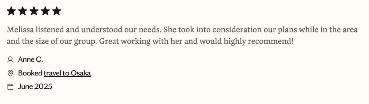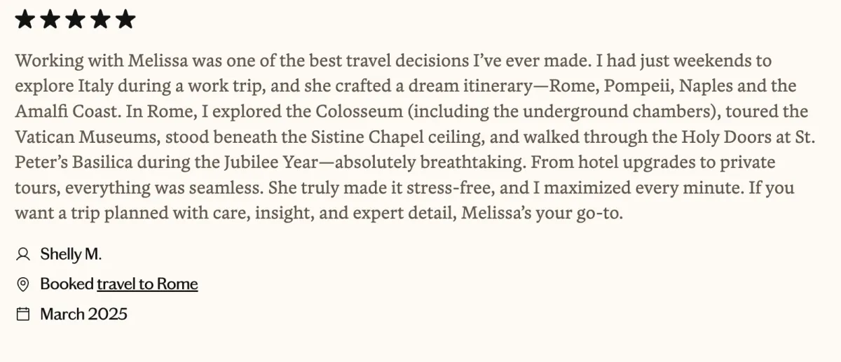 Melissa is part of the global Fora network, offering perks at 5,000+ hotels and travel partners worldwide. You get to work with a professional who knows how to make the most of your time and budget.